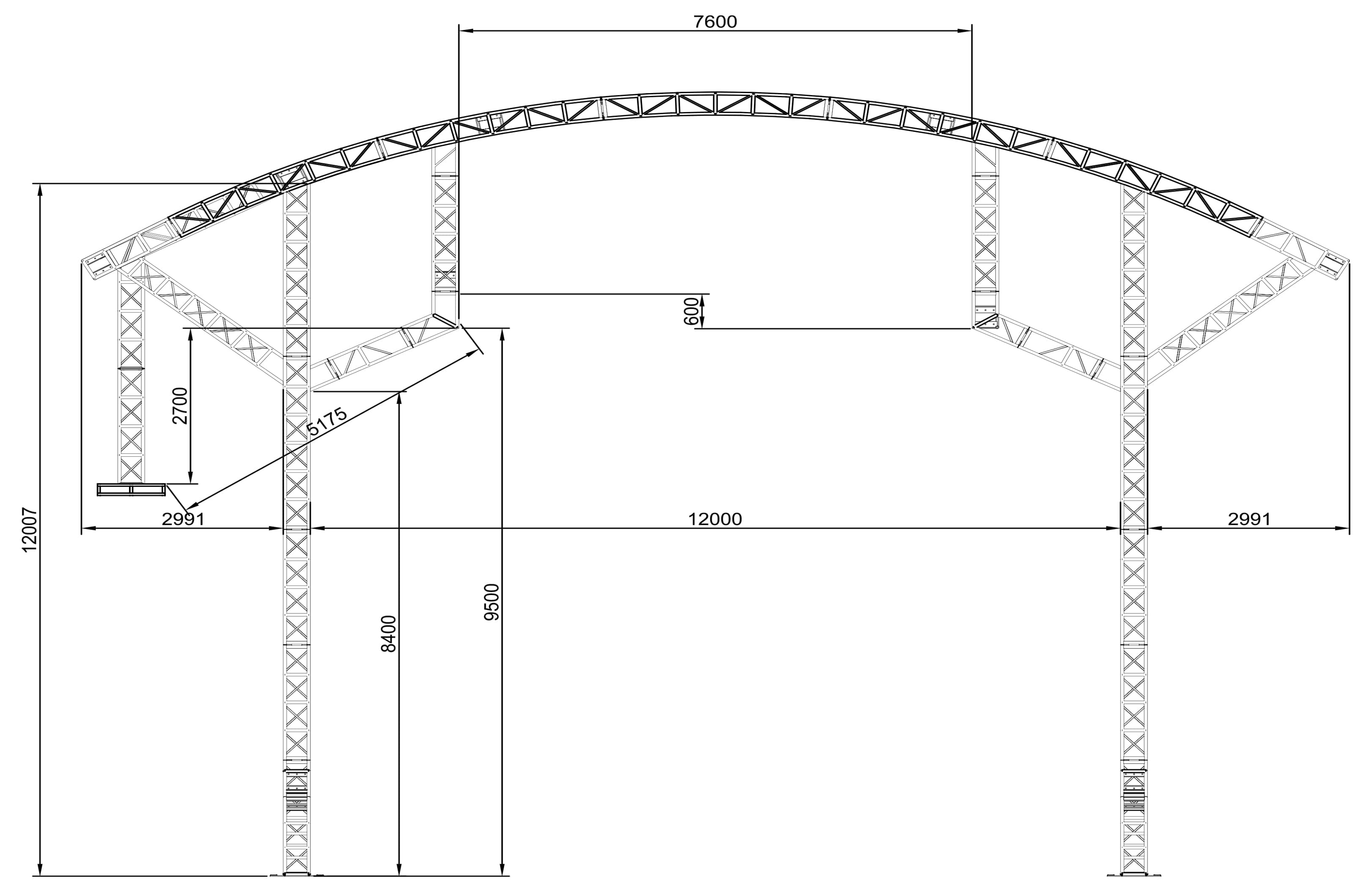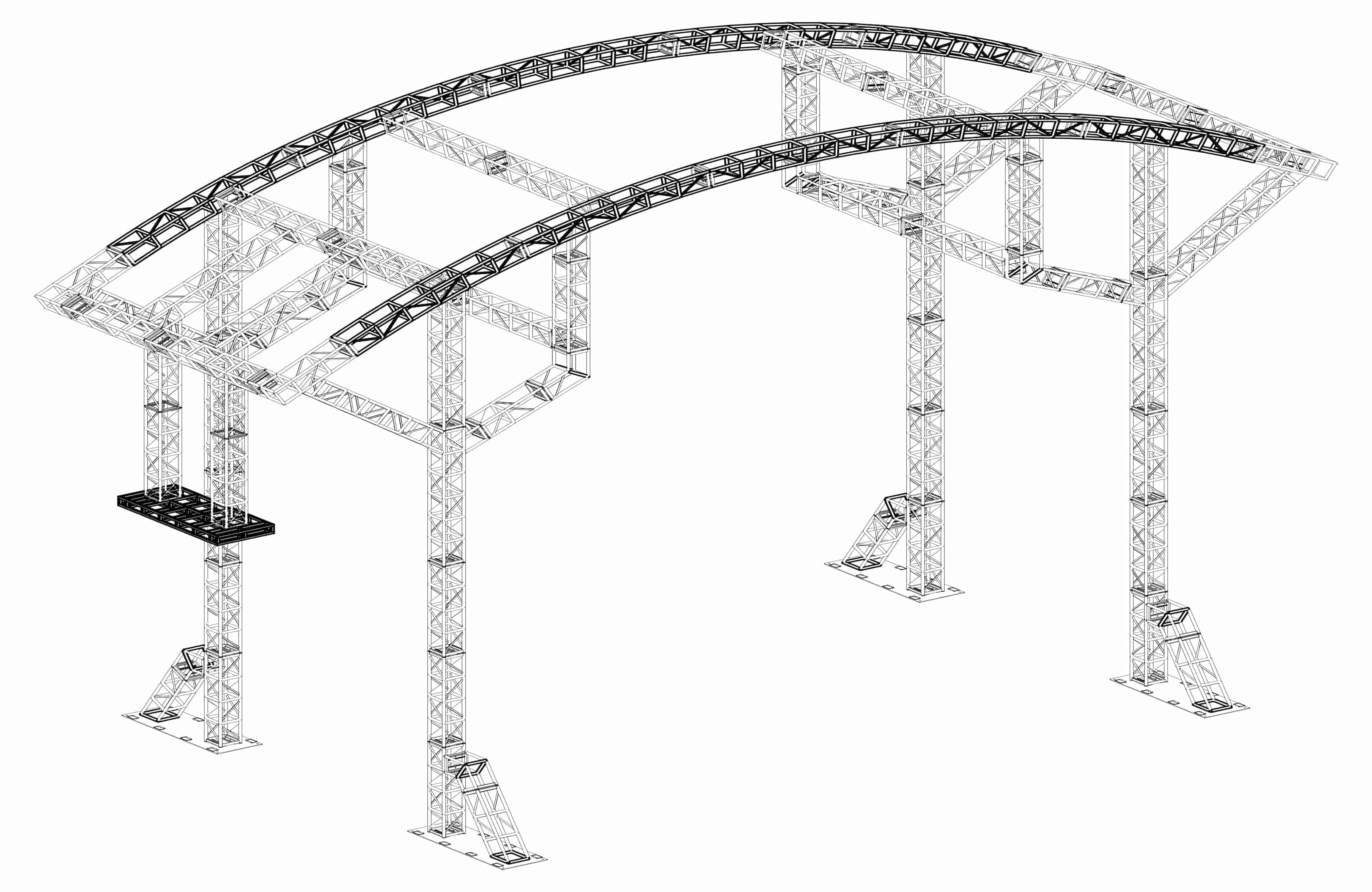Эта изогнутая ферменная конструкция размером 18 х 5 х 12 м изготовлена на заказ для акробатических выступлений. Согласно требованиям заказчика, левая сторона конструкции должна быть на 60 см выше правой, а расстояние между подвесными элементами по обеим сторонам должно составлять 8 м.